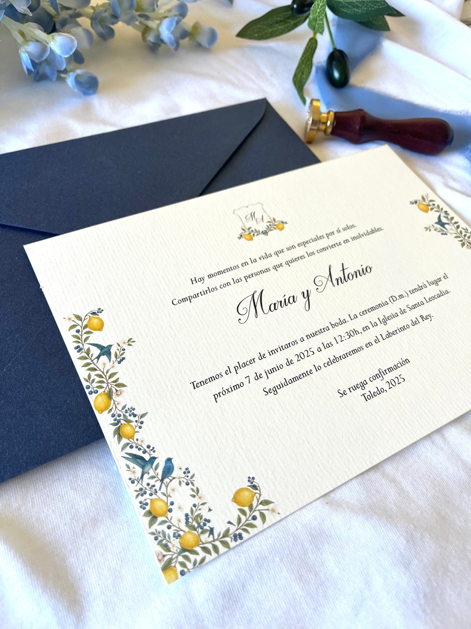 Celebra tu amor con una invitación que evoca la frescura y la dulzura de la naturaleza. Esta exquisita invitación presenta una delicada ilustración de pájaros azules que revolotean entre ramas de limoneros y dulces arándanos. la ilustración vibrante y llena de vida, crea una atmósfera campestre, romántica y serena. Perfecta para parejas que buscan una celebración al aire libre, llena de encanto y elegancia natural.